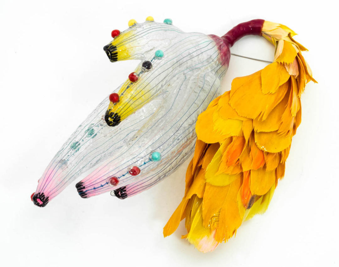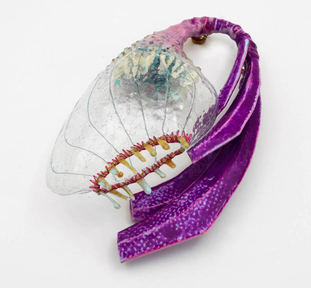 藝術(shù)家自述道,“在每個(gè)生長(zhǎng)階段,細(xì)胞自身的形狀產(chǎn)生變化,不斷生長(zhǎng)、分裂、滅亡,創(chuàng)造了自然的秩序與和諧?!?這些晶瑩剔透的首飾作品在視覺(jué)上是細(xì)胞分裂、生長(zhǎng)和消亡的過(guò)程。在觸覺(jué)上,硅膠不同于玻璃的硬度,獨(dú)特的伸縮性和柔軟性結(jié)合多彩的視覺(jué),仿佛賦予了作品生命力。