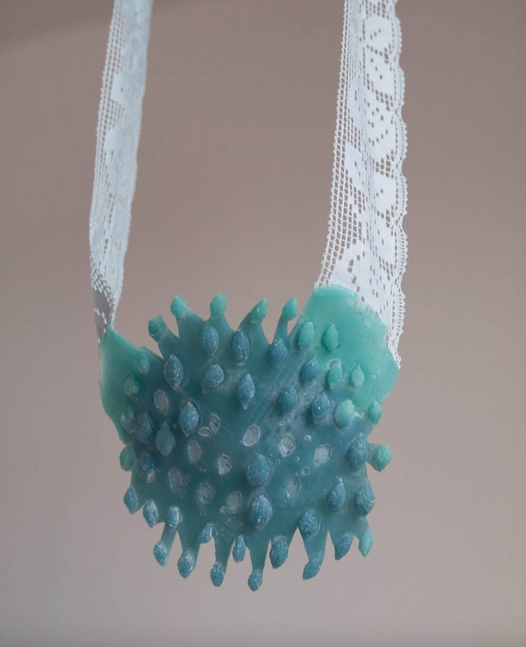 Andrea 喜愛(ài)收集老的或新的花邊,它們的價(jià)值或低或高。她也會(huì)將蕾絲和硅膠結(jié)合,將花邊縫在一起形成新的布料。她青睞于顏色之間、花紋之間的碰撞。Andrea的首飾在佩戴者身體周圍垂墜下來(lái),根據(jù)人的不同動(dòng)作而形成有趣的人與首飾之間的互動(dòng)。在其他作品中,她將蕾絲花邊及其他小的材料溶于硅膠中,花邊和裝飾花紋被固定在硅膠之中,形成永恒的創(chuàng)造性的花紋。