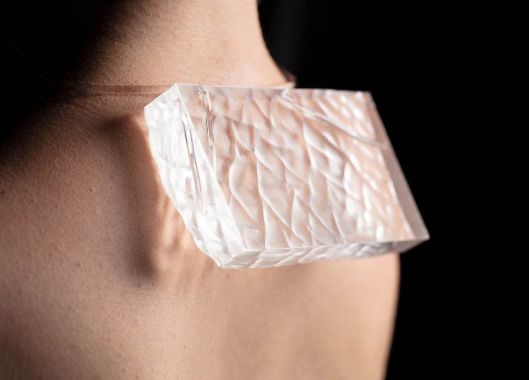 還有首飾藝術(shù)家,利用硅膠的透明性進(jìn)行創(chuàng)作。在Magdalena Schweizer 的作品中,她關(guān)注到皮膚,她認(rèn)為皮膚是人身上一個(gè)很重要的美的部分,是人的身體最外層包裹的部分。然而大多數(shù)皮膚都被衣物和其他的裝飾物所覆蓋,從而不被看到。在她的作品中,皮膚是她希望能通過(guò)材料展現(xiàn)出來(lái)的,通過(guò)皮膚與透明硅膠材料的對(duì)比,她希望觀眾關(guān)注到皮膚細(xì)節(jié)的紋路和形狀。