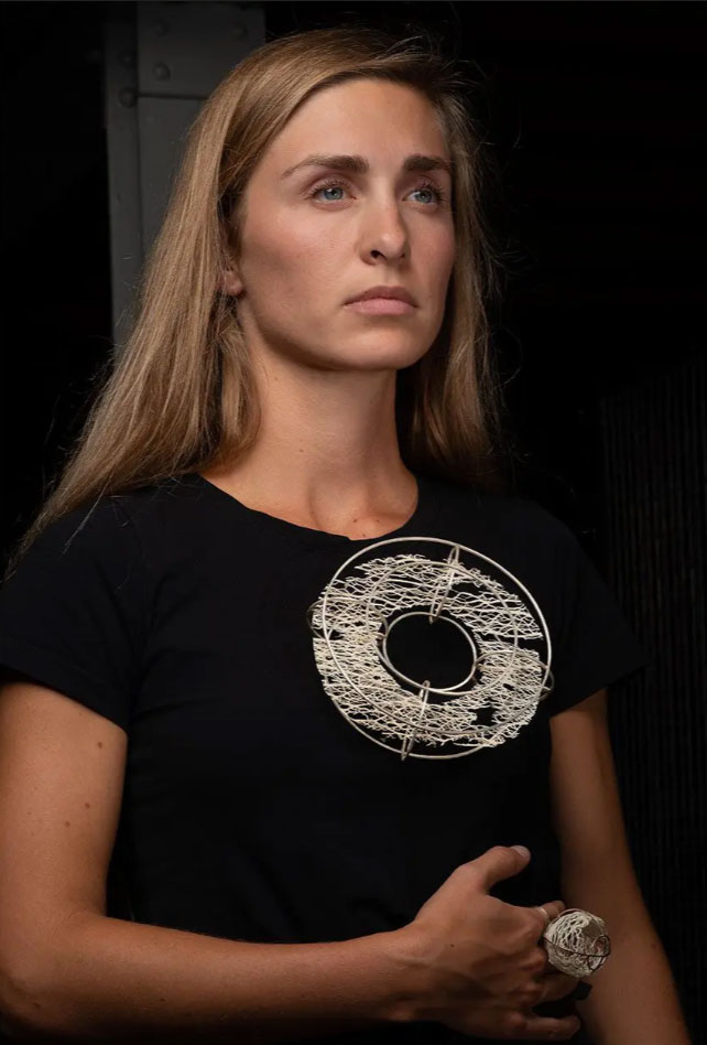 Feulner 專注于圓形來創(chuàng)作項(xiàng)鏈和胸針,這些作品在本次展覽中相得益彰。在近期的探索中,她手鋸了金、銀、青銅和粉末涂層鋼,以創(chuàng)造出不同表面紋理的形狀及其無數(shù)次迭代。據(jù)這位藝術(shù)家說,“循環(huán)是對一種形式及其運(yùn)動(dòng)的無聲關(guān)注——圓圈……尋找它的重復(fù)和旋轉(zhuǎn)以創(chuàng)造節(jié)奏和平衡,并找到一條沒有明顯開始和結(jié)束的線條?!?nbsp;