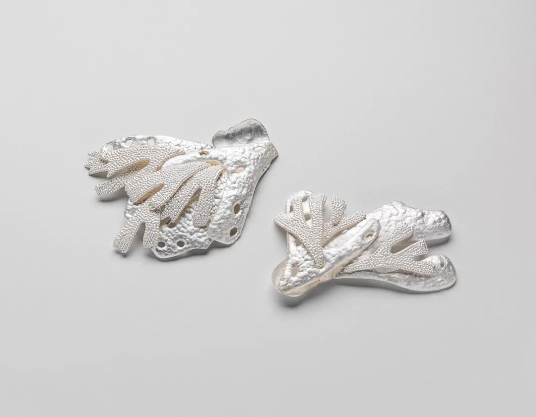 Juicy Fruits是 April Wood 的個(gè)展,通過展示各種被認(rèn)為是壯陽藥的食物,探索珠寶作為能指的作用,以及在整個(gè)歷史中傳達(dá)可用性、生育能力和繁殖力的一種手段。這件作品由精心手工切割的鋼花邊制成,成型和焊接。郁郁蔥蔥的蕾絲圖案貫穿整個(gè)表面,有時(shí)掩蓋了形式的真實(shí)性。在這些裝飾精美的物品中,觀眾看到了營養(yǎng)和感官喚醒之間的聯(lián)系。