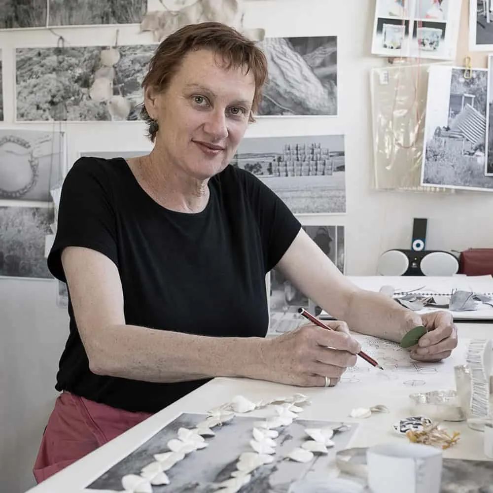 Julie Blyfield已經(jīng)實(shí)踐了 30 多年,目前在她自己的獨(dú)立工作室里,俯瞰著她在南澳大利亞梅蘭茲的花園環(huán)境。Blyfield 的首飾和實(shí)物作品的靈感來自對植物標(biāo)本、歷史銀器收藏和澳大利亞豐富多樣的景觀的研究,她使用金屬追逐、錘擊和表面鑿刻技術(shù)來解釋這些,主要是純銀和最近的銅。