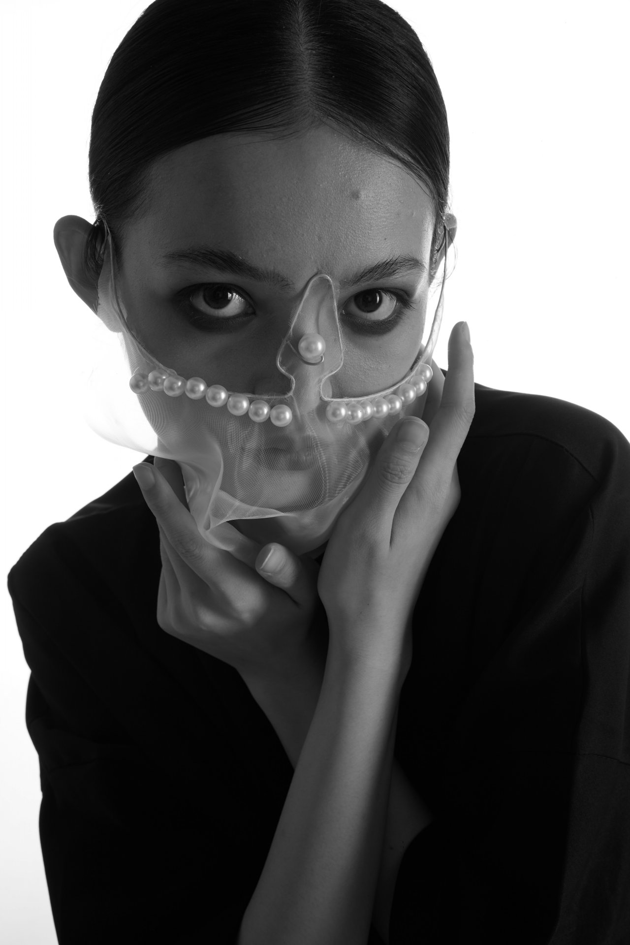 在《保護(hù)色》這系列作品中,我以化妝為出發(fā)點(diǎn),創(chuàng)作了一系列可佩戴的面紗首飾。我從化妝教程中獲得靈感,使用銀絲概括臉型和五官的形狀,用白紗覆蓋面部,并用珍珠點(diǎn)綴高光和腮紅。我還運(yùn)用粘土和金屬制作了可替換的美瞳和假睫毛,這些部分來(lái)自于我對(duì)同學(xué)妝容的夸張觀察。當(dāng)我佩戴這系列自帶妝容的首飾時(shí),會(huì)給我?guī)?lái)安全感,就像變色龍的保護(hù)色。