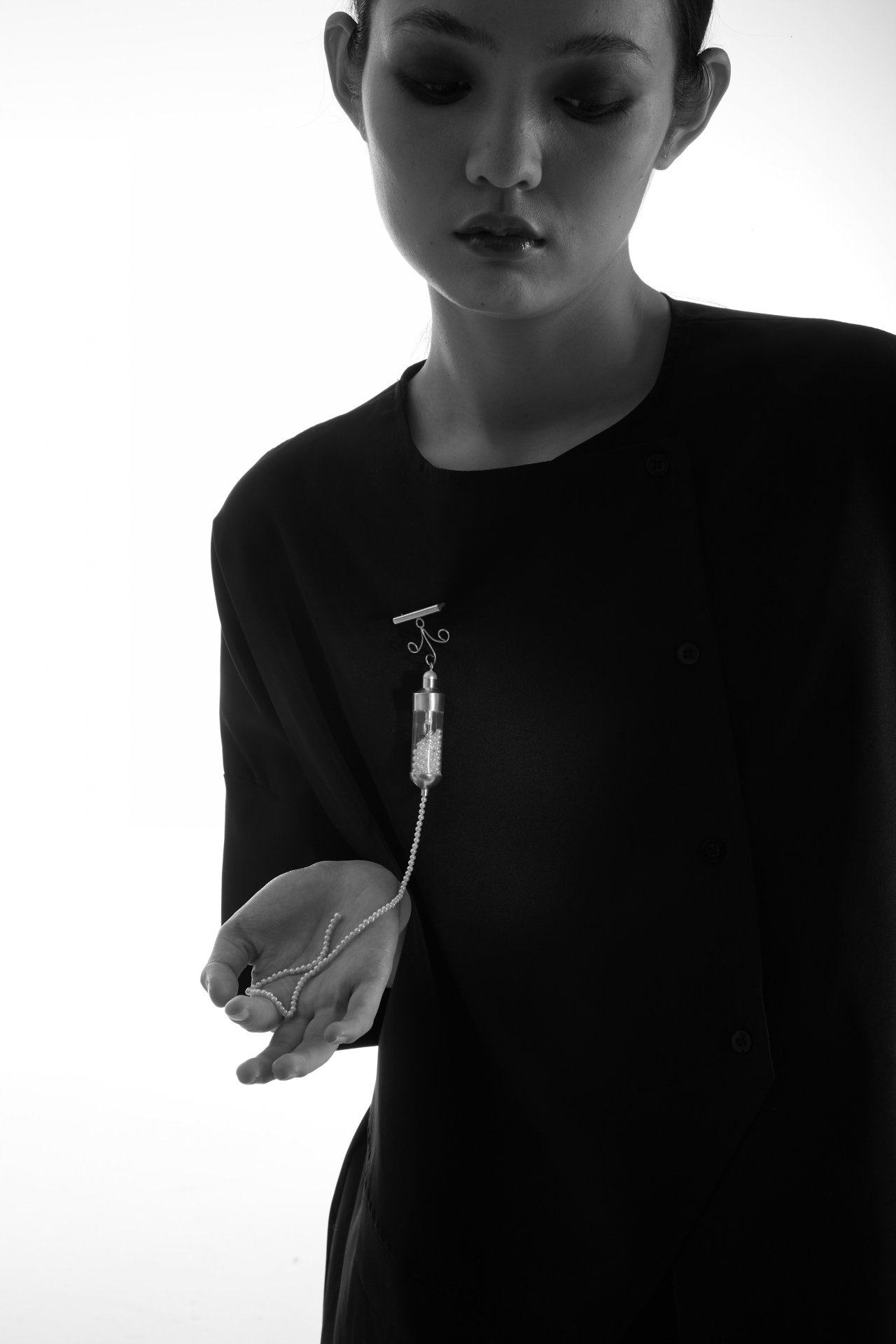 《閃爍的水滴》系列作品的靈感來自于我手臂上的一個疤痕,這個疤痕是在我生病期間由留置針留下的。在我住院治療的一年里,這根留置針一直保留在我的手臂上。隨著時間的流逝,我逐漸覺得它就像是一件飾品被佩戴在我的手臂上。因此,我開始思考將醫(yī)療器械轉化為首飾的可能性。在這個項目中,我的三件作品分別來源于與自身經歷相關的三件醫(yī)療器械:輸液器、留置針和醫(yī)用貼紙。并在作品中加入了珍珠和水晶等材料來表現(xiàn)輸入身體的藥品和我的血液,使作品在還原使用過程的同時也增強了其作為首飾的裝飾性。