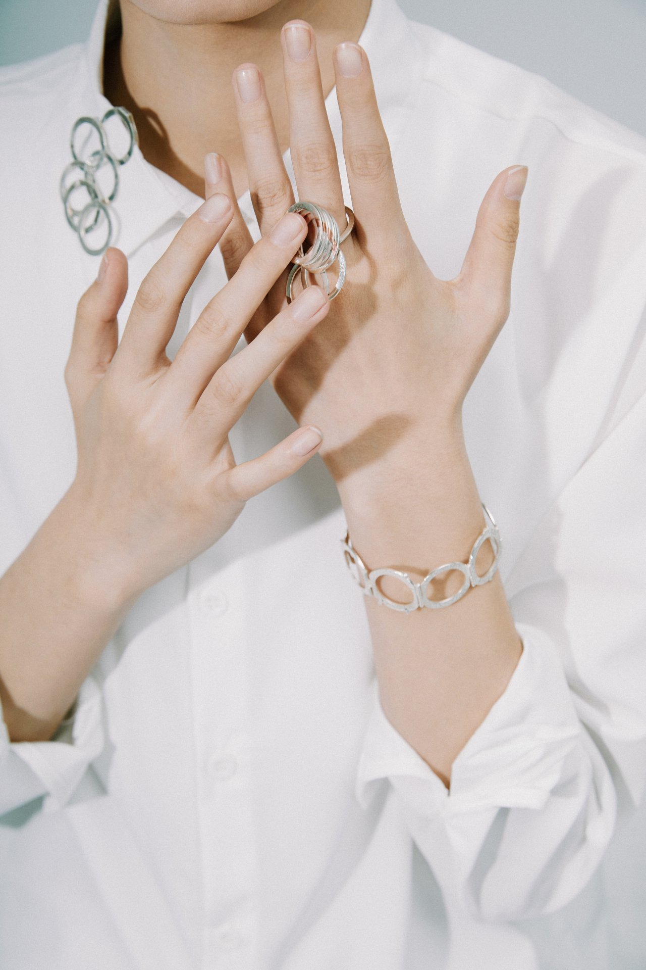 另外我的《圓》探索了珠寶的基本元素——“圓”的可能性,并將它衍變出不同的佩戴方式。我通過重復(fù)、疊加、排列或組合多個基本元素,試圖打破常規(guī)的珠寶形式,。