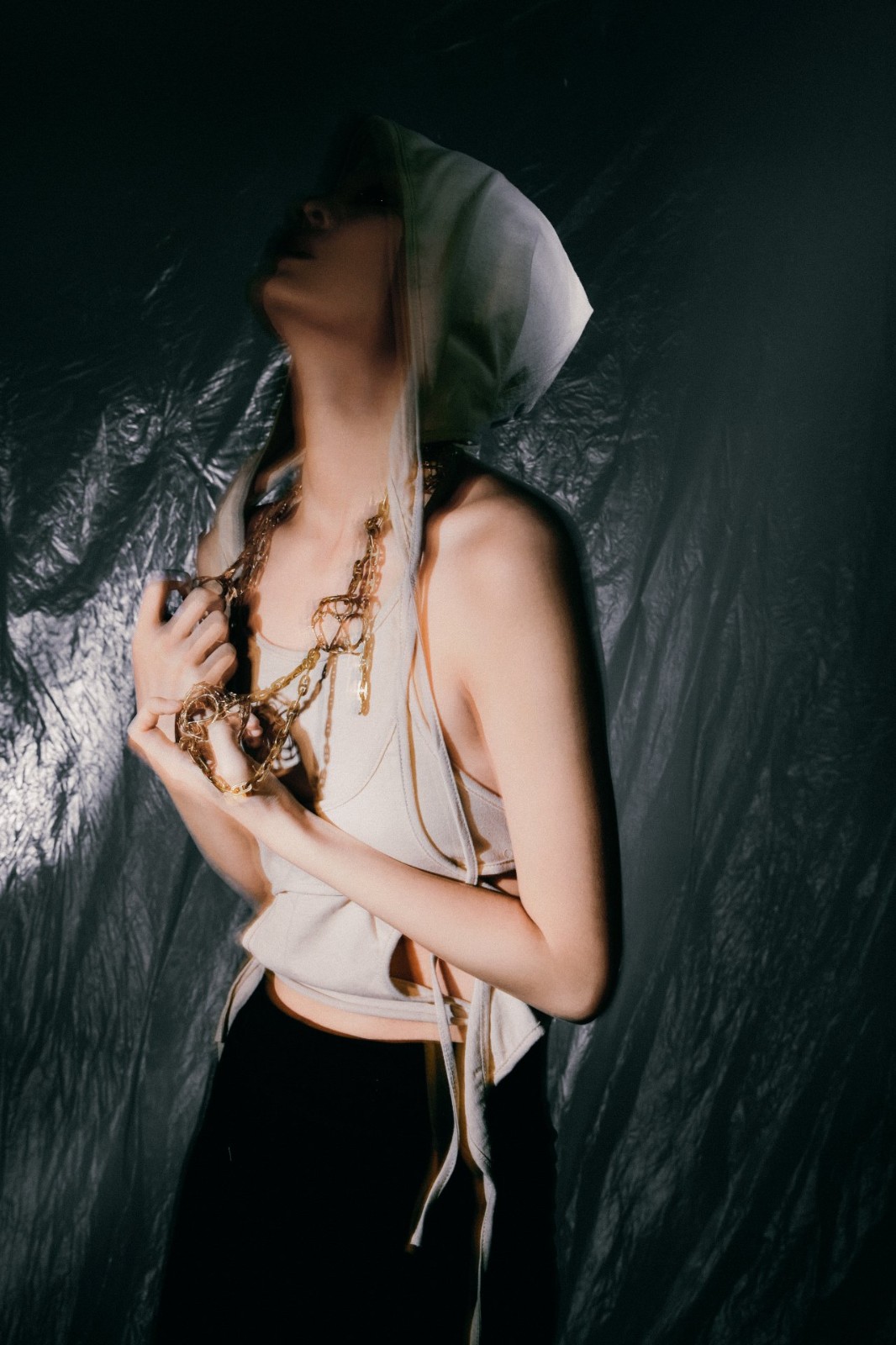 《鈴鼓》是一系列能隨著人體的運(yùn)動而發(fā)出聲音的首飾。首飾和音樂有相似之處,都可以提高人們的精神滿足感和舒適感。受到中國傳統(tǒng)配飾步搖和禁步的啟發(fā),當(dāng)人佩戴它們行走時,配飾上的金玉相互碰撞會發(fā)出令人愉悅的聲音。于是我想通過人們不同的行為來探索人與首飾對象之間的關(guān)系,這可能會給觀眾帶來更有趣的穿著體驗和一種獨(dú)特的心理感受。