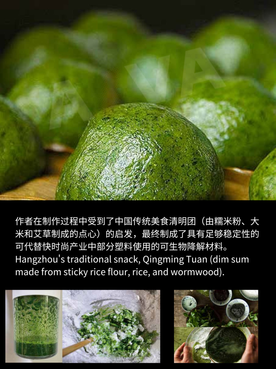 “我想做這個(gè)項(xiàng)目是基于現(xiàn)在快時(shí)尚產(chǎn)業(yè)產(chǎn)生的環(huán)境污染和資源浪費(fèi)。但是,由于目前限制快時(shí)尚產(chǎn)業(yè)發(fā)展是不太現(xiàn)實(shí)的,所以我想從我們配飾材料的角度出發(fā)來制作一些可降解的材料?!?/p>
