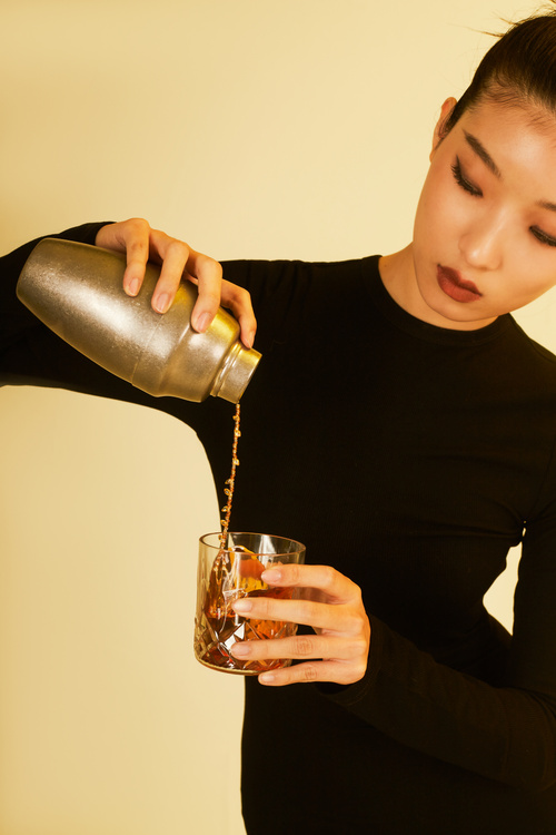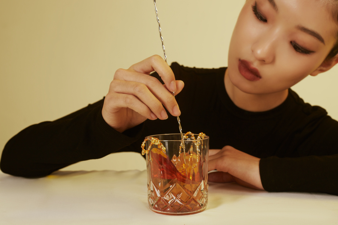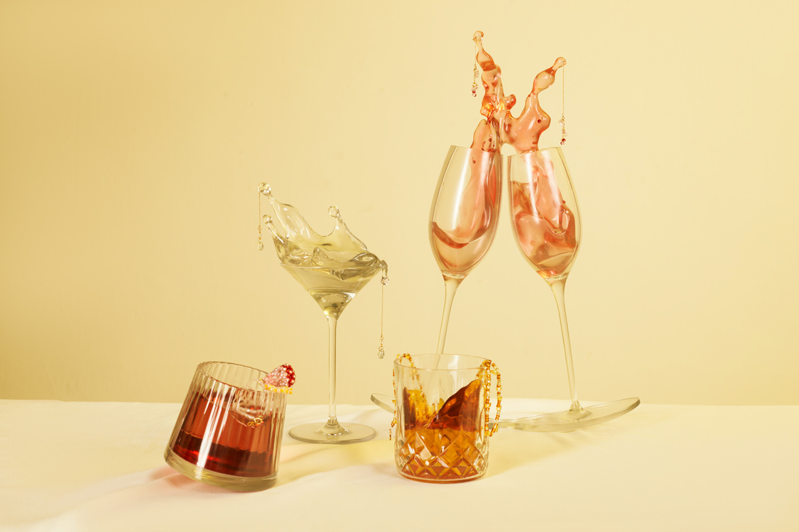 我的愛好之一是品嘗與調制雞尾酒。在喝酒和調酒的過程中,酒液往往處于不穩(wěn)定的狀態(tài),欣賞透明的酒液流動的場景,是調酒帶給我除了美味之外的另一種享受。作為一名首飾設計師,我將酒液飛濺的瞬間定格,并將其設計成首飾架和配套首飾。
