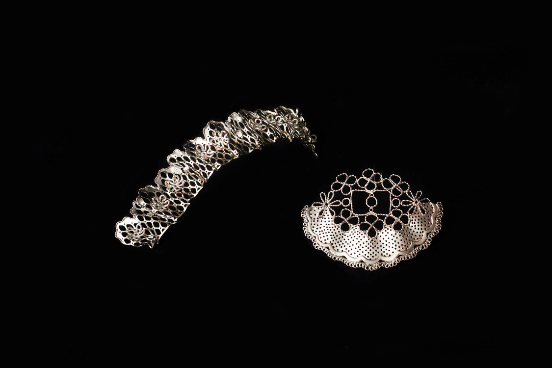 《Laced Armor》這個項目靈感來源我將洛麗塔裙作為日常服飾穿著的經歷。如今許多人認為穿著洛麗塔服飾是一種“媚男”的表現(xiàn),因為許多洛麗塔模特都呈現(xiàn)白幼瘦的外貌。但在我看來,洛麗塔是女性以極度夸張的形式表達自己女性特質的一種方式。它幫助我表達自己的個性,并成為了屬于我自己的柔軟鎧甲。蕾絲是洛麗塔服飾中不可或缺的元素,因此我將其作為作品的主題。蕾絲通常被認為是柔弱易碎的,但我希望我的作品能表現(xiàn)出我和所有熱愛洛麗塔風格的女性的堅韌和頑強。因此,我決定用金屬重新表現(xiàn)衣服上的蕾絲,盡可能保留蕾絲的圖案和紋理,以營造出對比的效果。