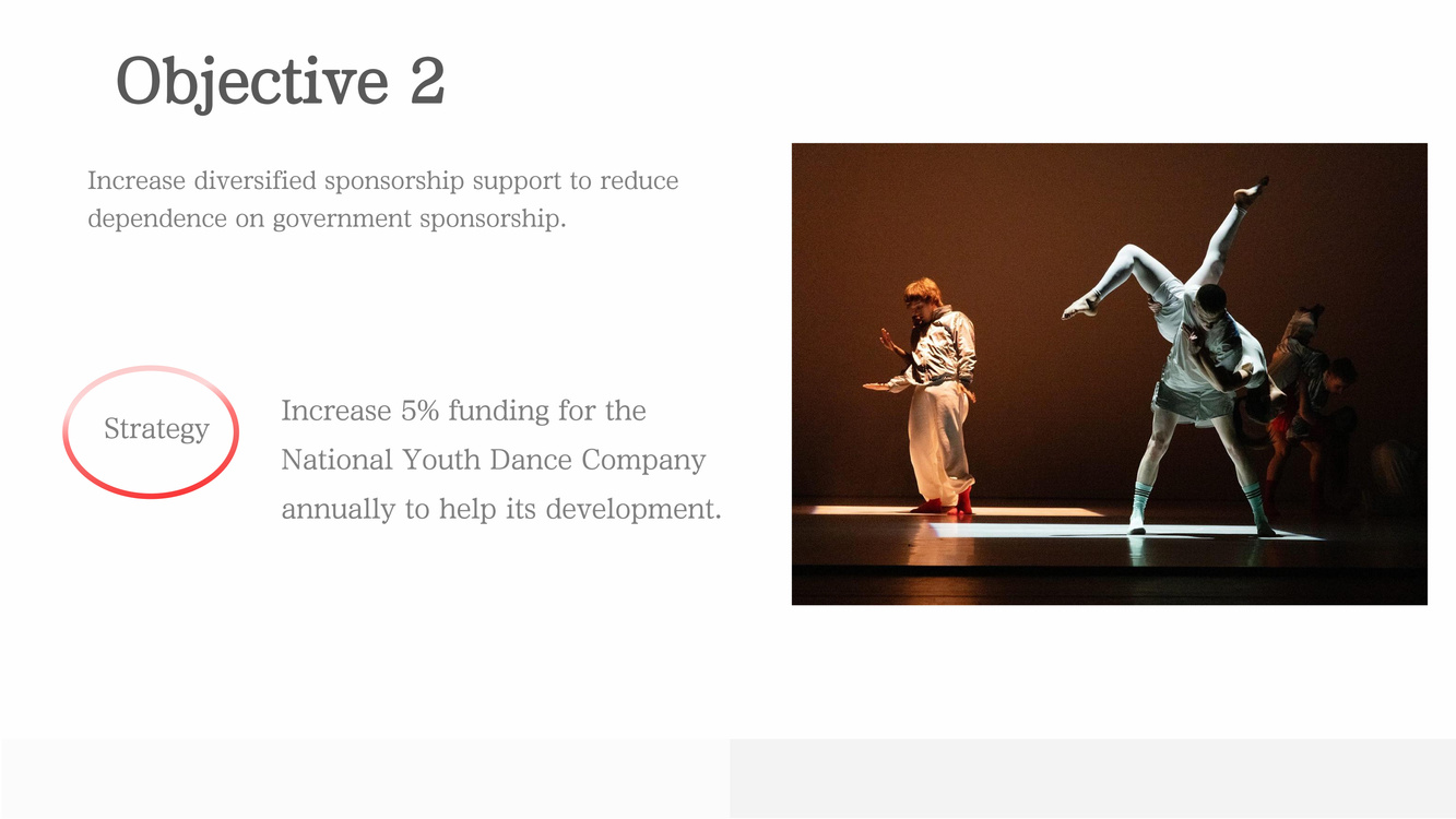 沙德勒之井劇院(Sadler's Wells Theatre)作為我個人主要研究組織,我從最初的劇院信息調(diào)研、往年財務(wù)報告、受眾群體、合作團體及其所涉獵項目等,到隨后應(yīng)用SWOT分析法對沙德勒之井劇院(Sadler's Wells Theatre)進行了內(nèi)外部優(yōu)劣勢分析,最終為其制定未來三年可行的發(fā)展策略。通過搜尋大量報告及藝術(shù)市場政策,我發(fā)現(xiàn)該劇院在脫歐、調(diào)平政策(Levelling Up Policy)及疫情影響等情況下仍有資金匱乏的問題存在。因此,我針對這些問題分別創(chuàng)建了舞團合作表演及教育項目集資方案,提出合作方法及數(shù)字影院與贊助商會員套餐等不同解決方案,以實現(xiàn)劇院設(shè)施改善及預(yù)備專業(yè)舞蹈演員的培養(yǎng)。