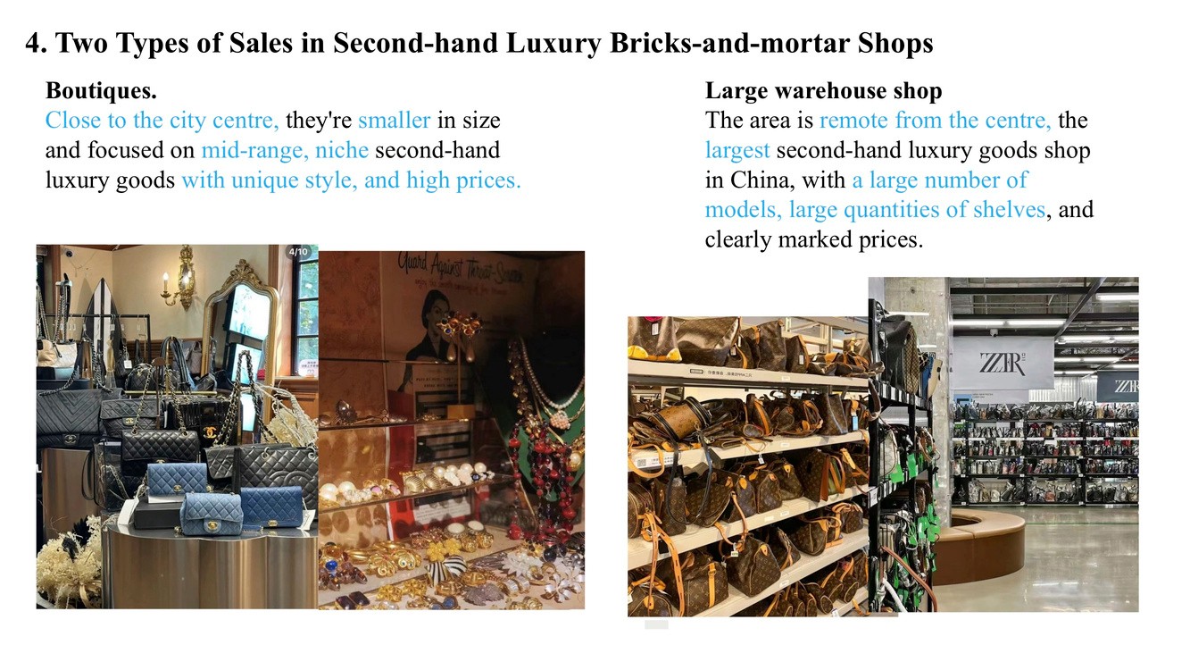 The "Consumption Study of Shanghai's Second-hand Luxury Goods Market" began with an investigation into the international context of the second-hand luxury goods market. The study then examined the types of stores in Shanghai, the procurement channels of buyers, and included surveys and interviews with customers. In recent years, the price of second-hand luxury items has risen due to economic factors and a growing environmental consciousness, leading more people to consider these goods. Emerging industries like online authentication services and relevant legal frameworks highlight the industry's development. However, I believe this sector has yet to establish itself as a trend, as most consumers remain reluctant to purchase used or pre-owned products. To foster further growth, the industry could enhance its visibility through mainstream media and leverage public figures to influence consumer perceptions. Additionally, improving post-purchase verification and seller accreditation services could reassure customers, encouraging greater trust in the market.