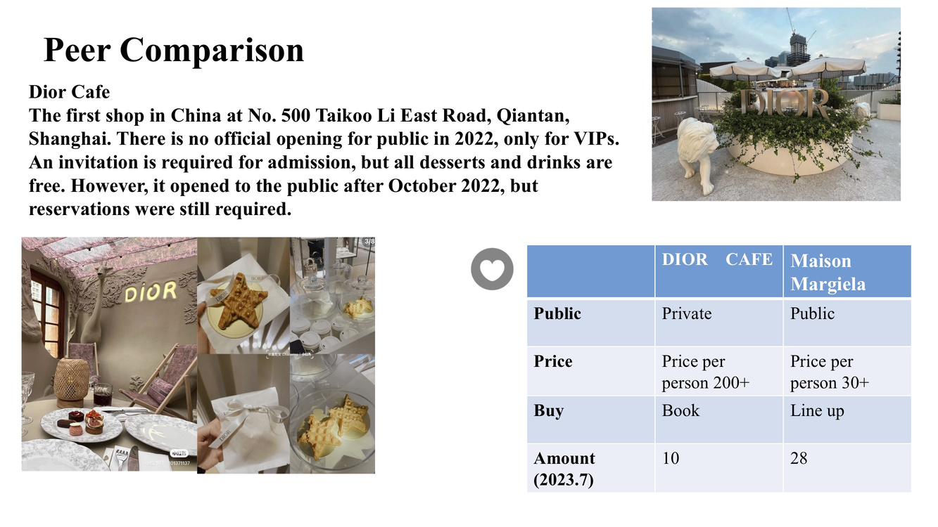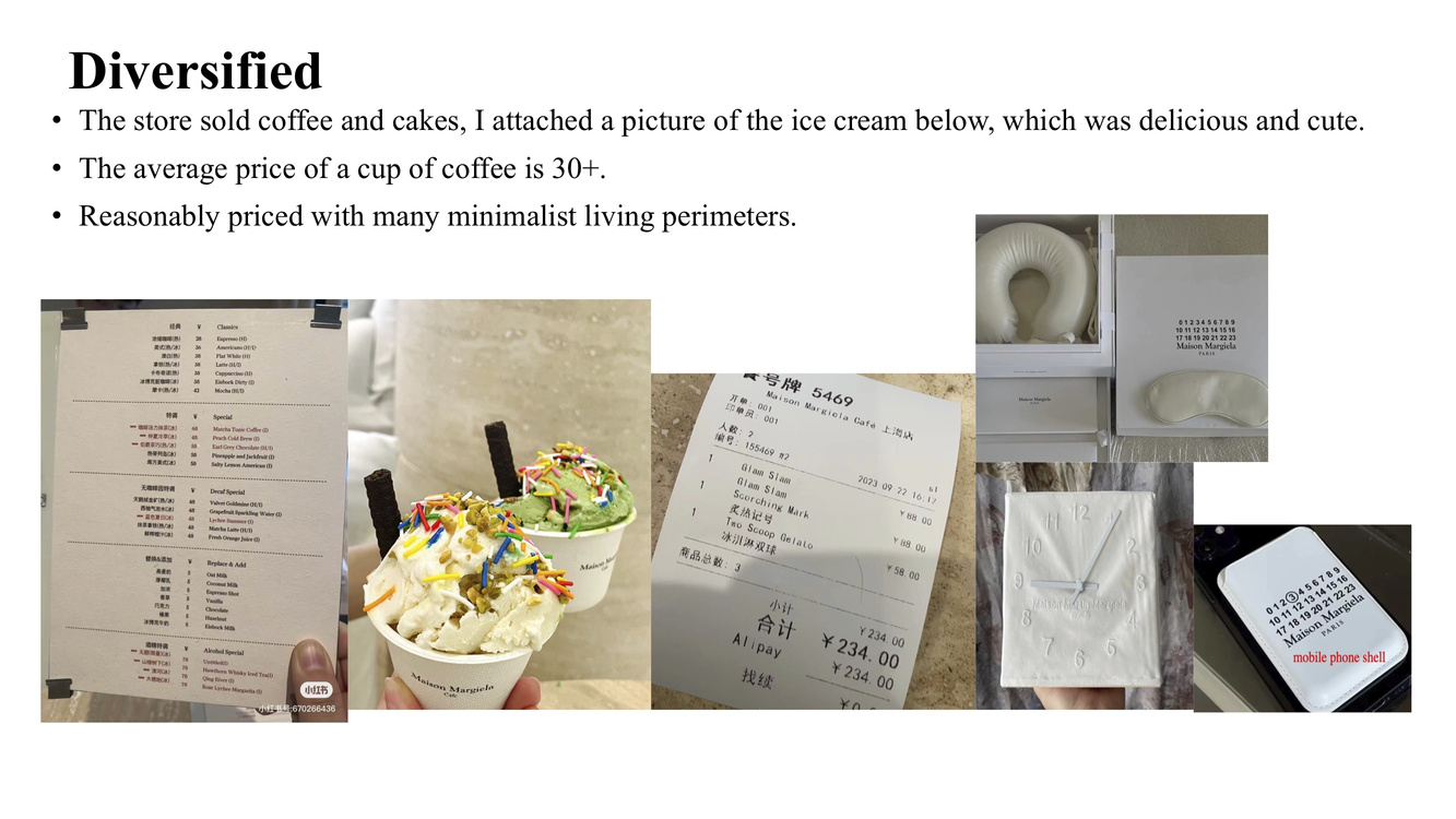 The Maison Margiela café in Shanghai, a venture of the fashion brand, piqued my interest. I conducted both online and on-site research of the café, which included analyzing its pricing, menu, location, and stylistic approach. Additionally, I interviewed consumers to comprehend their profiles and the brand's popularity among the general public. A comparative analysis revealed that the café targets a mainstream clientele, with coffee flavors and meal designs that reflect the brand’s aesthetic and philosophy.
