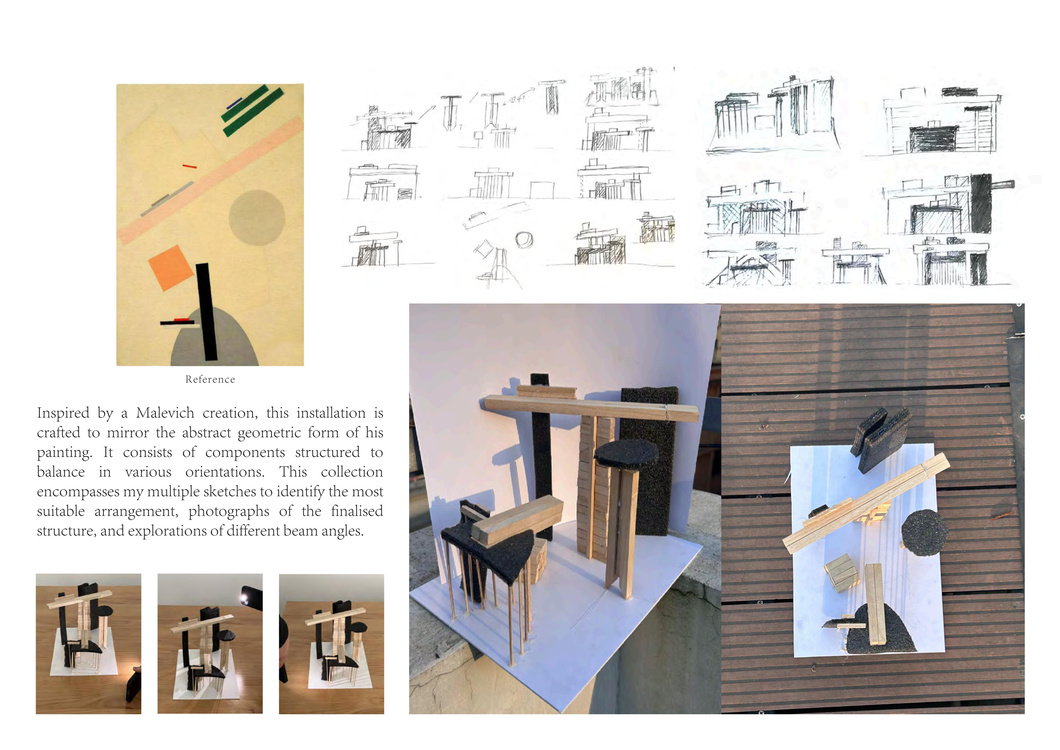 最后在《超現(xiàn)實主義對建筑設計的影響》項目,以我偏愛的藝術家馬列維奇及其標志性的超現(xiàn)實主義風格為題材,向他致敬。它旨在解構和重組他的一幅藝術作品,構思出一種能夠展現(xiàn)超現(xiàn)實主義對建筑設計潛在影響的裝置。
