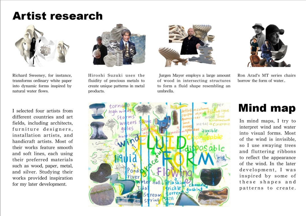 For the first project "Fluid Form ", I was inspired by four artists and started with materials, trying paper, clay, wire mesh and other materials. Place art installations in the lobby of the aquarium, and use large-scale buildings to occupy the main position, allowing visitors to better perceive the space.