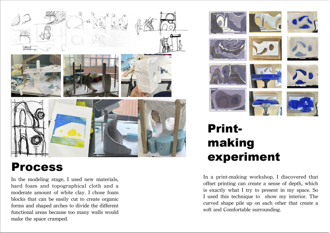 The second project " Significant Object " started from the shape of my precious pencil case and designed a space for myself that can carry my own emotional needs. The model material is made of hard foam, cloth and white clay, and the overall lines are soft and comfortable.
