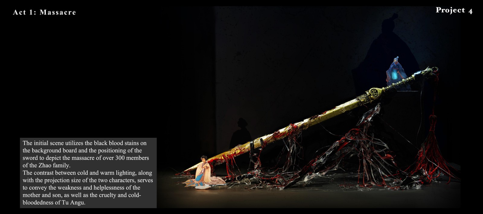 Orphan of Zhao marks the culmination of my learning experience. I enhanced the stage effects through projections and lighting, intensifying the tragic atmosphere. This traditional Chinese drama explores themes of loyalty, sacrifice, and justice, depicting a prolonged struggle against evil. The forces of justice, represented by the protagonist, exact a painful toll in their pursuit of revenge.