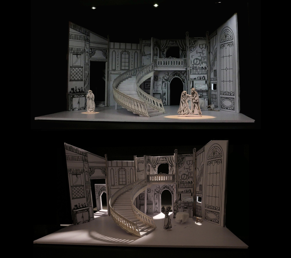 《當(dāng)你老了》這個項(xiàng)目讓我能夠制作不同的場景來展示愛情在各個階段的進(jìn)展:相遇、求婚和老年。 盡管我發(fā)現(xiàn)這個項(xiàng)目對我來說具有挑戰(zhàn)性,但它使我加深了對敘事詩意意象的理解。除了為古典文學(xué)設(shè)計(jì)舞臺之外,我還為《愛麗絲夢游仙境》設(shè)計(jì)了一個非傳統(tǒng)的舞臺,融入了鮮艷的色彩和鏡子等元素,讓觀眾沉浸在愛麗絲的魔法世界中。此外,在描繪19世紀(jì)女性悲劇《朱莉小姐》的過程中,我加強(qiáng)了塑造白模的技能。通過對細(xì)節(jié)的審視,文本與模型的區(qū)分成為一種旨在對比社會地位的雙層建筑設(shè)計(jì),最終象征著主人公的困境。我的目標(biāo)是通過打造這個經(jīng)典舞臺來強(qiáng)調(diào)女性角色的力量和獨(dú)立