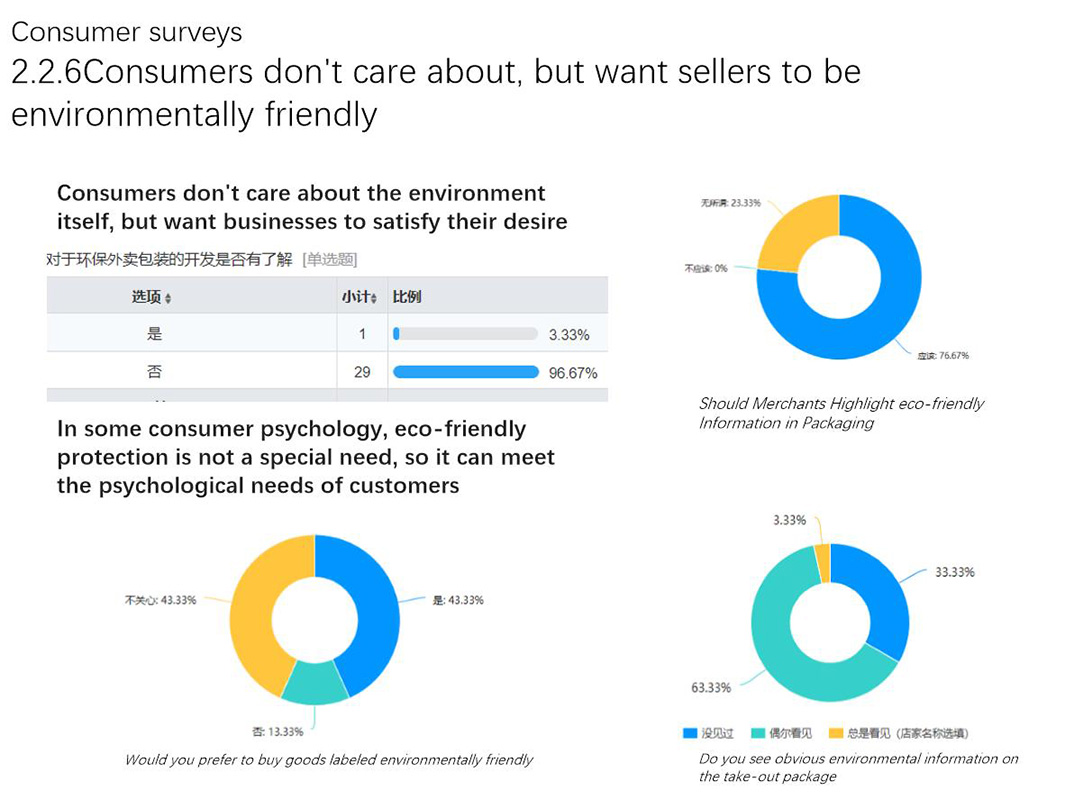 在我的第二個(gè)項(xiàng)目中我調(diào)研的是外賣包裝的環(huán)保問題。城市生活的節(jié)奏越來越快,伴隨著外賣行業(yè)的需求量激增,環(huán)保這個(gè)亙古難題一次又一次成為主流話題。早在兩年前,中國兩大外賣公司就推出過環(huán)保項(xiàng)目,但是并沒有激起巨大變革。所以我試圖在我的項(xiàng)目中去探討究竟是什么因素阻礙了環(huán)保包裝推廣?是材料?是技術(shù)?還是人群意識(shí)?