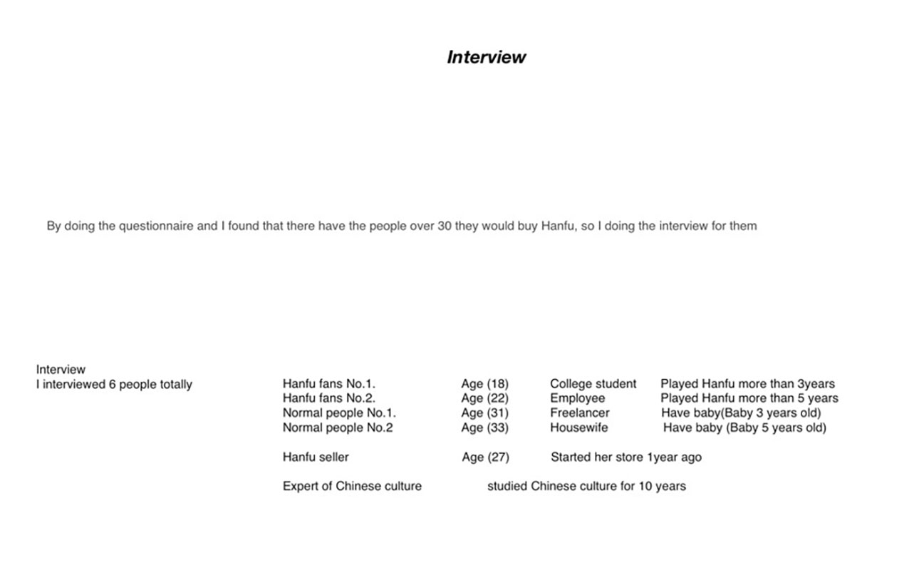 在我的研究中,我主要采用定性分析與定量分析靈活結(jié)合的方式。在<Urban Autism> 和<Constant and changeable ballet shoes>的研究中,我主要采取了定性的研究方式。而在 <The research of Hanfu industry in Chinese market> 的研究中,我主要采取了定量的研究方式。我選擇<The research of Hanfu industry in Chinese market>作為上學(xué)期的主要研究項(xiàng)目主要是因?yàn)闈h服是近年來很火熱的一個(gè)話題。同時(shí),在2019年,李子七的視頻又重新把漢服帶成了全世界最火的話題。