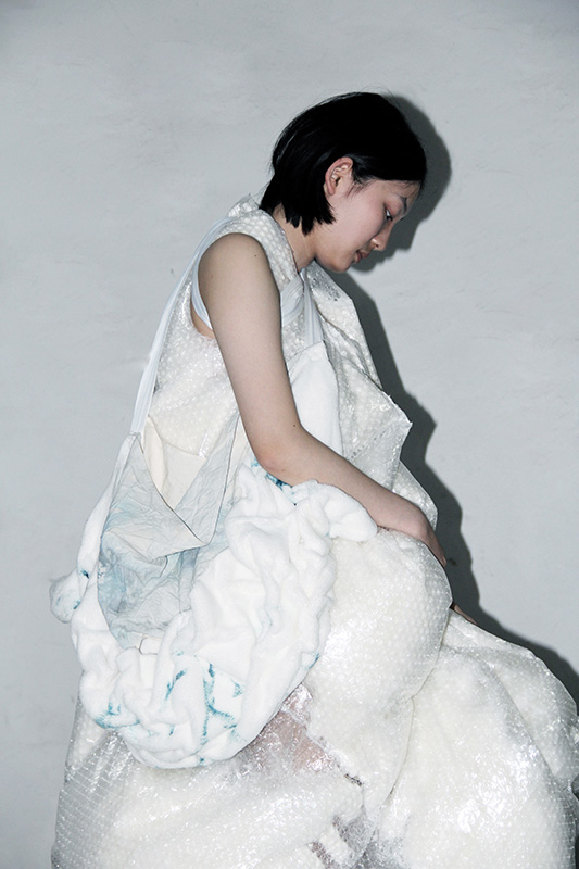比如作品《怪癖》就講述了Vicky生活中不知不覺形成的古怪行為?;趯ψ约荷畹挠^察,這些怪癖包含了童年的記憶和無意識的喜好。Vicky Miao 渴望通過服裝作品來表達對自己的了解,而不是以語言的方式直白的講述。所以,她運用到的各式各樣的制作方法大多都源于生活的經(jīng)歷。例如,塑封機處理的想法來源于封牛軋?zhí)前b的記憶。