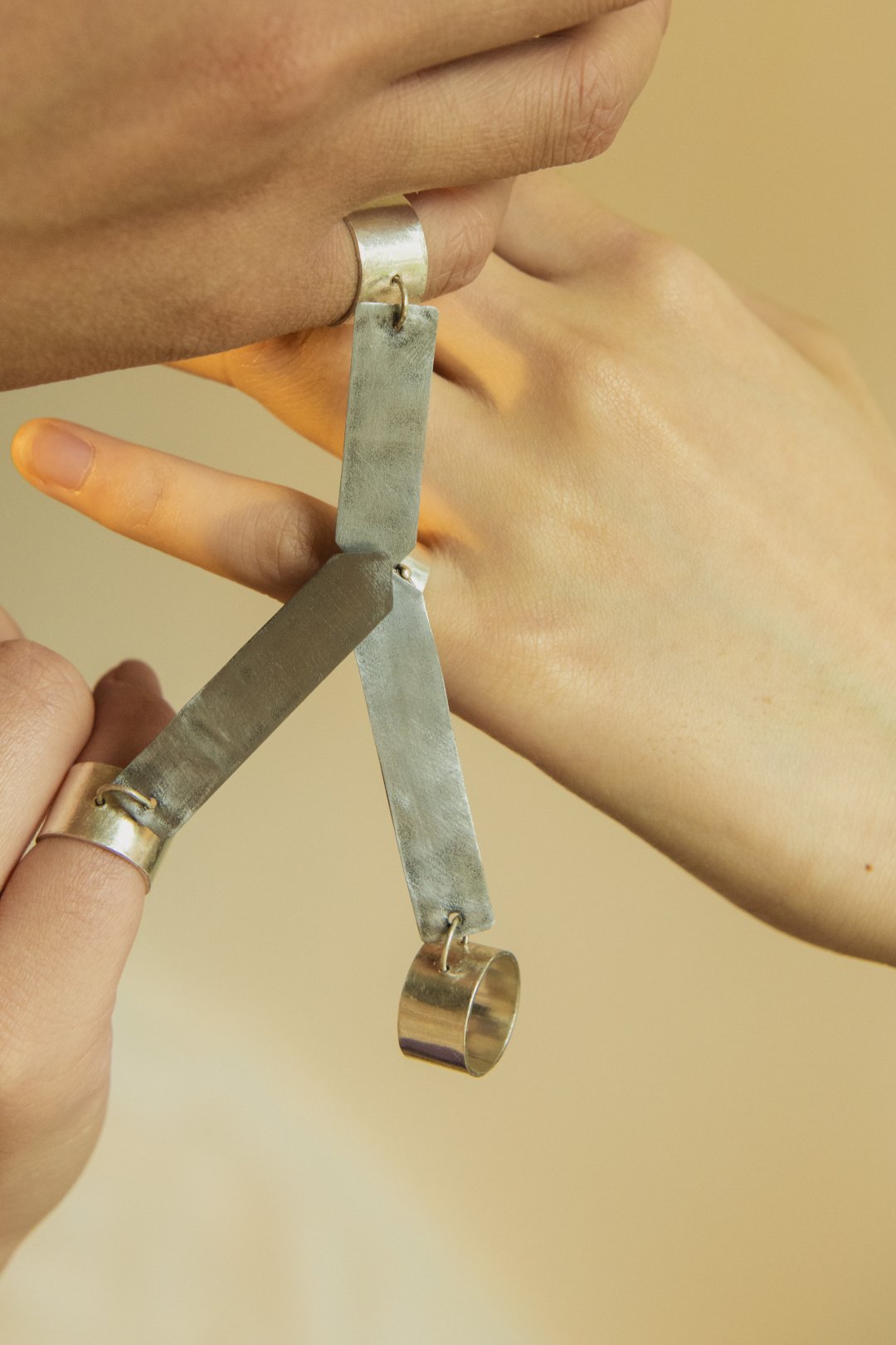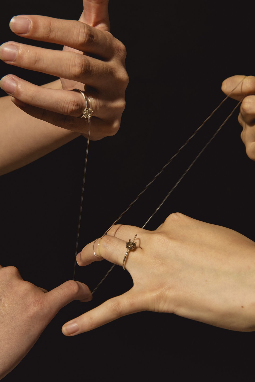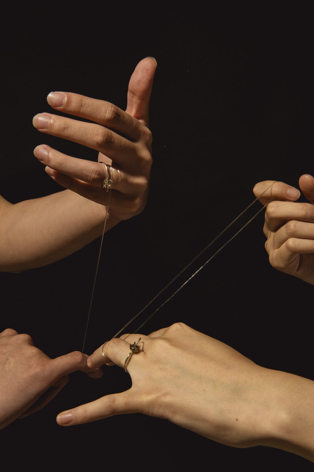 在項目《Wrapping》中我通過視頻展示曾經(jīng)自己追求完美主義的行為,在創(chuàng)作過程中剖析行為的源頭,最終意識到不斷追求遮蓋瑕疵只是虛假的“完美”。項目《Necklace》是首飾和游戲的結(jié)合,以金屬項鏈為線索結(jié)合不同的新材料,與觀眾互動進行探索首飾秘密的游戲?!禝nterpersonal Rings》 中每一件首飾靈感都來源于特定的事件,用首飾的語言具象化其在人際關(guān)系中帶來無形的影響。