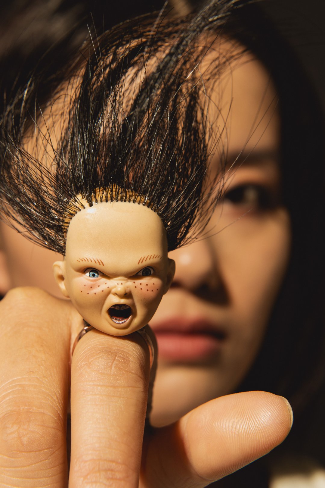 在作品《Hair》里我嘗試把自己的頭發(fā)做了很多測試,包括燒、染、融合硅膠等。在測試的過程中,我發(fā)現(xiàn)輕微燙一下頭發(fā)的時候特別像葫蘆蘚,所以我把頭發(fā)染成紅色,并且把它做成了一個小盆栽。雖然它不具備佩戴性,但是從這個測試過程中我得到了啟發(fā),并且愛上了這種測試新材料的做法。