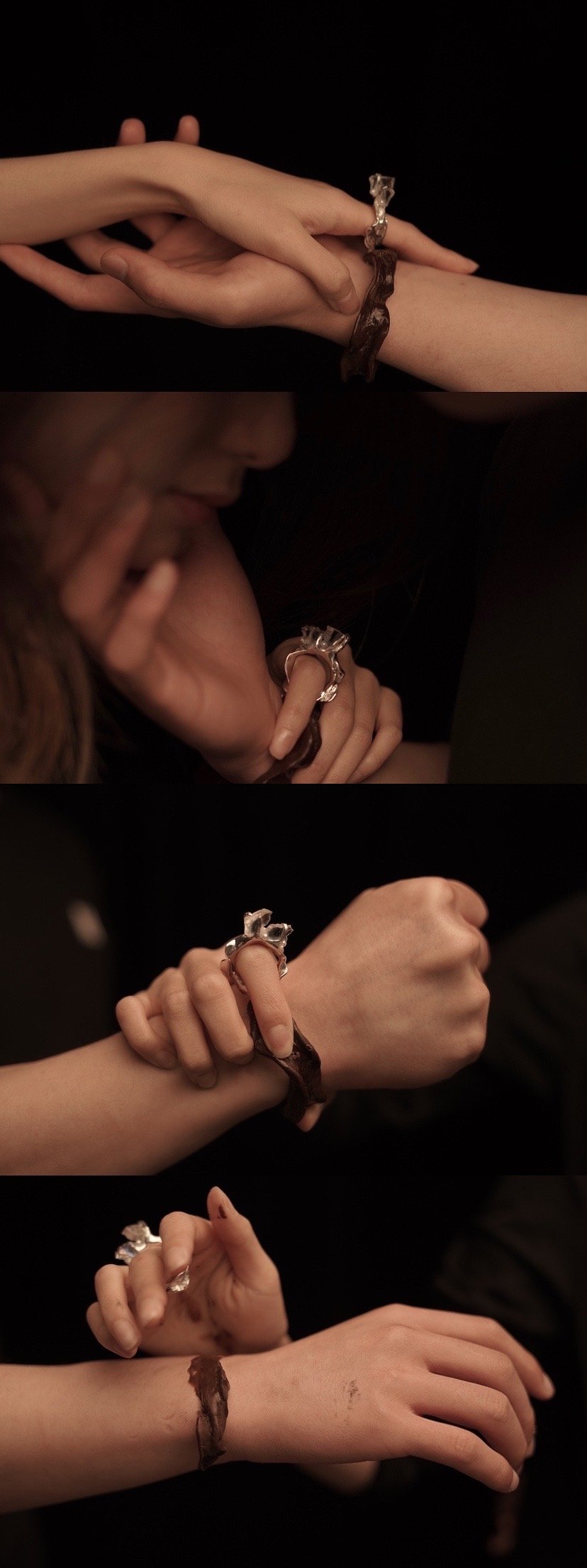 我認為首飾是佩戴者情感和內(nèi)在精神世界的一種表達,作品《Melbourne Told Me》構(gòu)建的是悉尼一些場景中的日落,我希望通過首飾這個媒介展現(xiàn)我對這座城市的獨特視角和懷念之情。我擅長并喜愛使用暖色金屬與特殊材料創(chuàng)作,在作品《Anxious Attachment》中,我使用蜂蠟和巧克力等特殊材料去展現(xiàn)婚姻中兩個人獨特的情感關(guān)系。蜂蠟具有辨識度的甜美香氣,棕黃透明的色澤給人帶來足夠的溫暖;巧克力的材質(zhì)也使作品顯得更加新穎特別,所有的一切都是我內(nèi)心特定情感的折射。當(dāng)我追逐這種表達形式,將其真實呈現(xiàn)在我創(chuàng)作的首飾上時,我將獲得無限的樂趣與成就感。