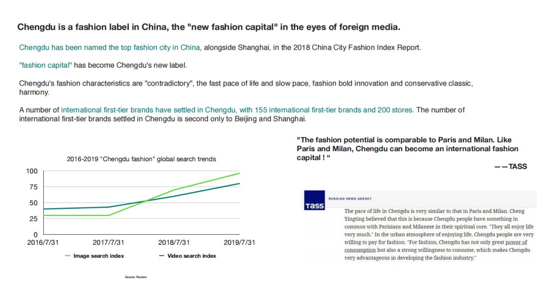 我的第三個(gè)項(xiàng)目靈感來(lái)源于《2018中國(guó)城市時(shí)尚指數(shù)報(bào)告》中成都被評(píng)為與上海齊名的“中國(guó)時(shí)尚一線城市”的報(bào)告內(nèi)容。所以我試圖在我的項(xiàng)目中探討研究成都成為中國(guó)潮流標(biāo)簽的原因。從成都的基本地域情況,人民的作息習(xí)性、消費(fèi)觀價(jià)值觀,以及成都潮牌文化的發(fā)展去分析研究成因。為此,我進(jìn)入上海時(shí)裝周實(shí)習(xí)了兩周的時(shí)間,研究成都服裝零售市場(chǎng)的市場(chǎng)推動(dòng)因素是什么?成都電子商貿(mào)業(yè)務(wù)興旺的原因?成都市場(chǎng)如何劃分的更細(xì)致了以及成都多品牌營(yíng)運(yùn)的方式?最后,我從發(fā)展和趨勢(shì)兩方面總結(jié)了成都潮流市場(chǎng)的未來(lái)走向。