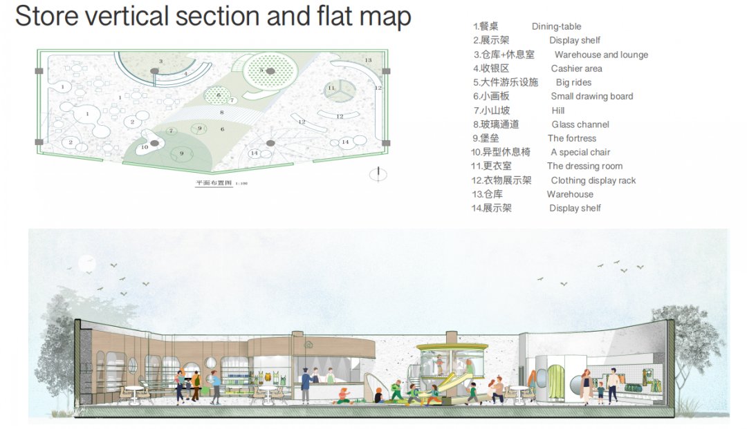 最后一個(gè)項(xiàng)目《Breathe experience store》是一個(gè)商業(yè)中心的店鋪設(shè)計(jì)。店鋪的視覺效果是以綠色、橘色為主,白色為輔的純凈空間,強(qiáng)調(diào)空間的美觀實(shí)用與親近大自然并重,旨在繁華快節(jié)奏的商業(yè)中心里,不僅讓大人,也讓孩子們創(chuàng)造一個(gè)舒適,特別的購(gòu)買和體驗(yàn)的場(chǎng)所。