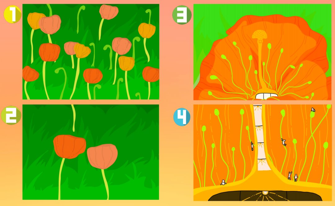 在本學期我最喜歡的一個項目是“花”,此系列是由8幅插畫構成的小故事。在故事里面我把花比喻成城市,花粉比喻成人類,而人們最終都會被外力給推向遠方。我的靈感來源于詩句“一花一世界”,看著一朵小花我會沉思,它可能就藏著一個宇宙。