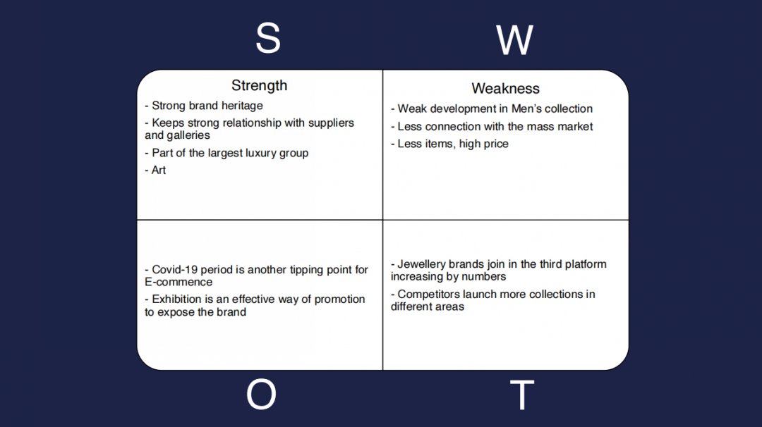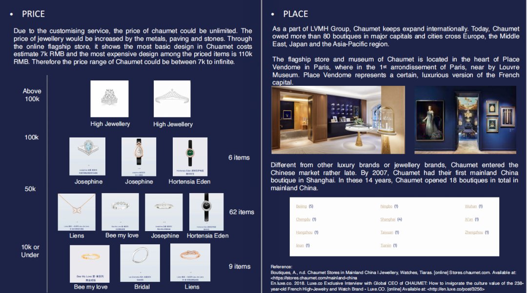 In my perspective, the learning process of jewellery management is becoming the strong connection between designer and clients. Help designer to present the concept and story to the wear, collect feedback from viewer to the maker. During the learning and practicing, I find the important of brand research. In the final report, I chose the famous French luxury jewellery brand CHAUMET as target. From its background, supply chain, 8P definition, consumer, competitor, environment, and SWOT to get conclusion for its future promotion. I understood connection during culture, art, and jewellery much better and great promotion strategies of a good luxury jewellery brand.