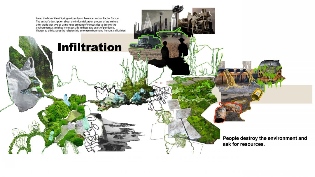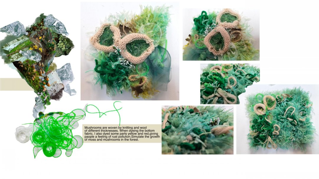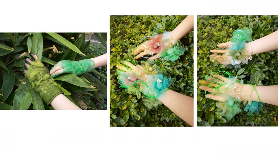 因?yàn)榧彝サ脑?,我從小就接觸到了許多面料,因此我對(duì)不同的材料的組合產(chǎn)生了濃厚的興趣,環(huán)保和可持續(xù)的概念也是我在創(chuàng)作設(shè)計(jì)項(xiàng)目時(shí)必不可缺的考慮方面。在作品《滲透》中,我以在森林中的塑料污染現(xiàn)象和《寂靜的春天》這本書(shū)為靈感進(jìn)行面料設(shè)計(jì)。在這個(gè)系列的作品中,我嘗試運(yùn)用多種非常規(guī)材料與傳統(tǒng)面料結(jié)合,例如:PVC面料,塑料管,紗,毛線等等,并通過(guò)結(jié)合多種技術(shù),如針織,滴膠凝固,熱風(fēng)機(jī)融解來(lái)體現(xiàn)污染和自然環(huán)境互相滲透的主題。最后我設(shè)計(jì)出了三副手套,以表達(dá)所有的污染都是人類(lèi)親手造成的這一理念,并在自然中拍攝了最后成品的照片和視頻,以表達(dá)手和環(huán)境無(wú)言的對(duì)話。