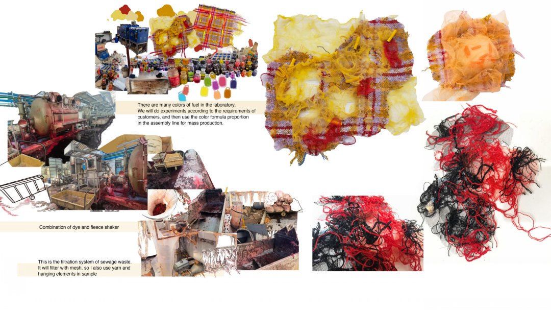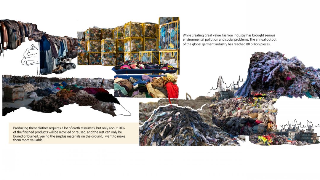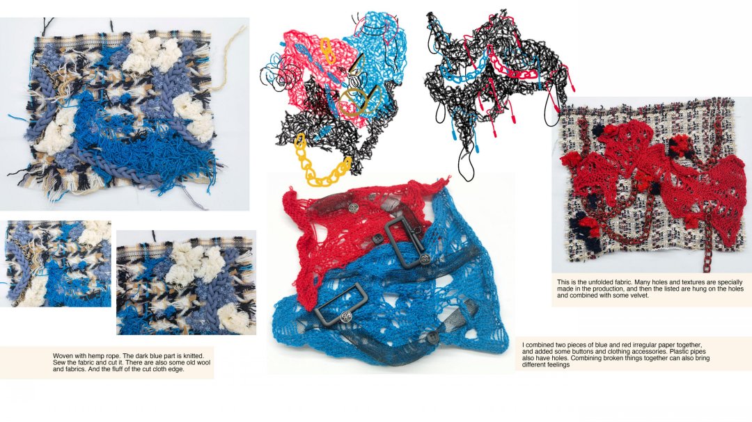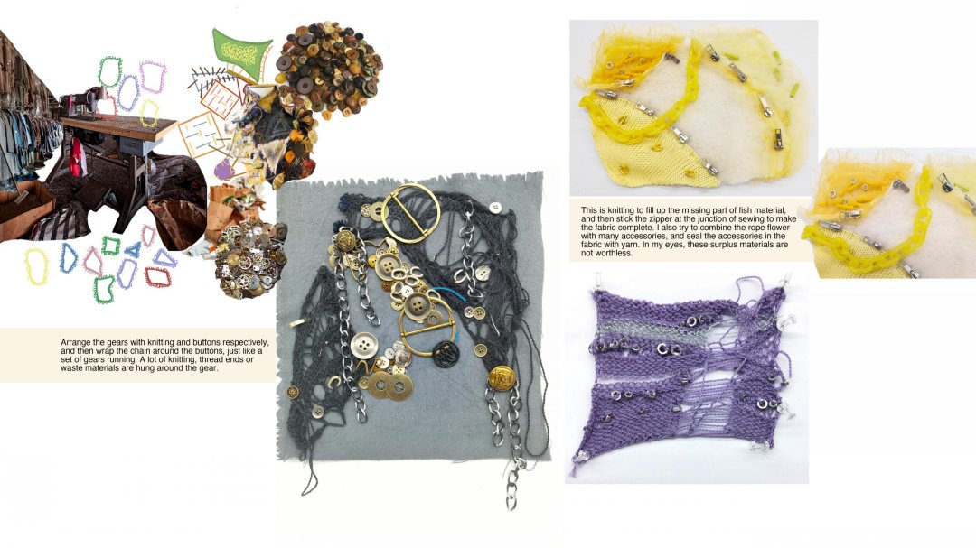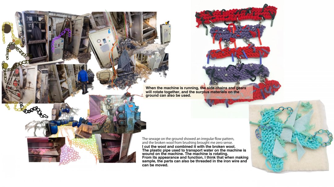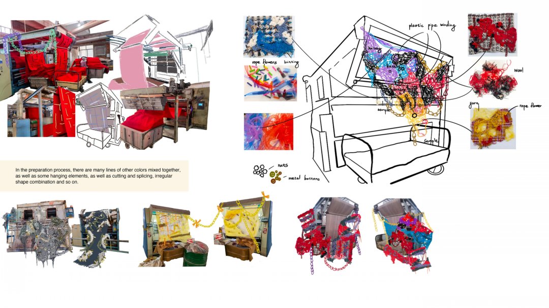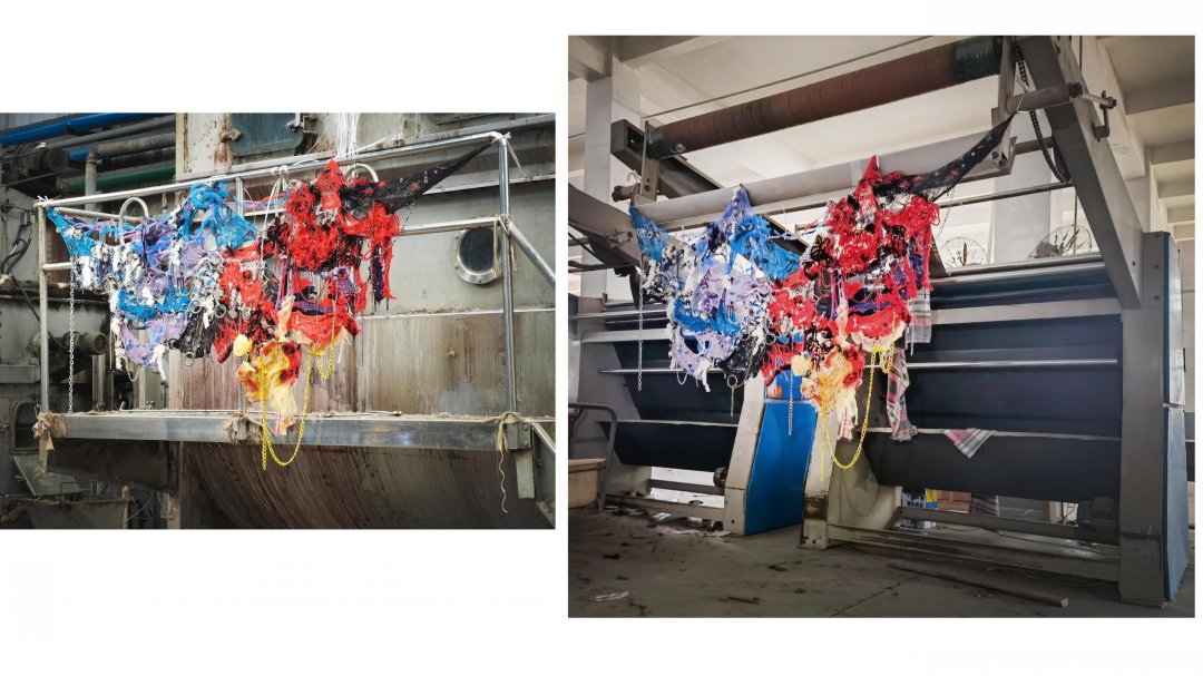 在作品《再生》中,我以在工廠里觀察到的面料浪費(fèi)現(xiàn)象為靈感,對(duì)服裝產(chǎn)業(yè)浪費(fèi)進(jìn)行了調(diào)研,利用工廠收集的廢棄面輔料來(lái)進(jìn)行創(chuàng)作。我從在工廠的一手調(diào)研拍攝中提取了面料懸掛、堆積、鎖鏈、機(jī)械零件、管道、打包繩、紐扣等元素,結(jié)合編織、針織、刺繡等多種工藝進(jìn)行面料設(shè)計(jì),體現(xiàn)出凌亂與規(guī)整間的對(duì)比、轉(zhuǎn)換。最后,我把所有面料組合成了一塊大的面料懸掛在了工廠的機(jī)器上,我認(rèn)為這些“不完美”的破損碎片組合起來(lái)有種豐富而特別的美感,與灰暗的工廠形成了強(qiáng)烈的對(duì)比沖擊。