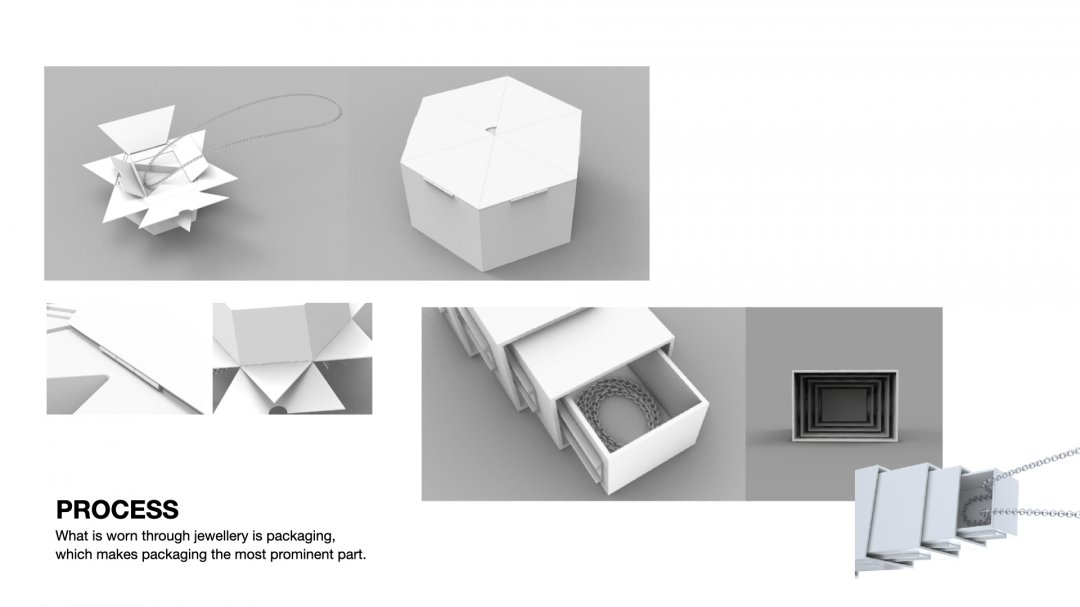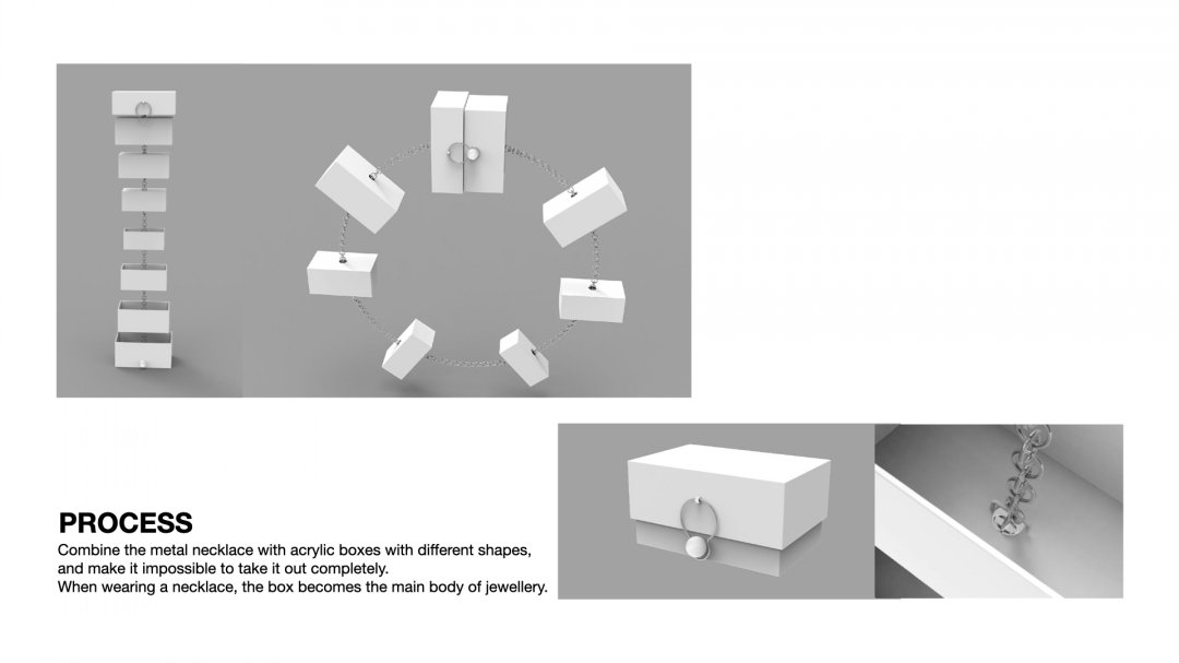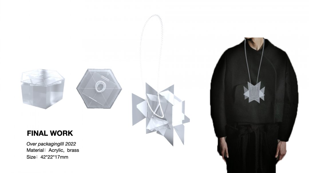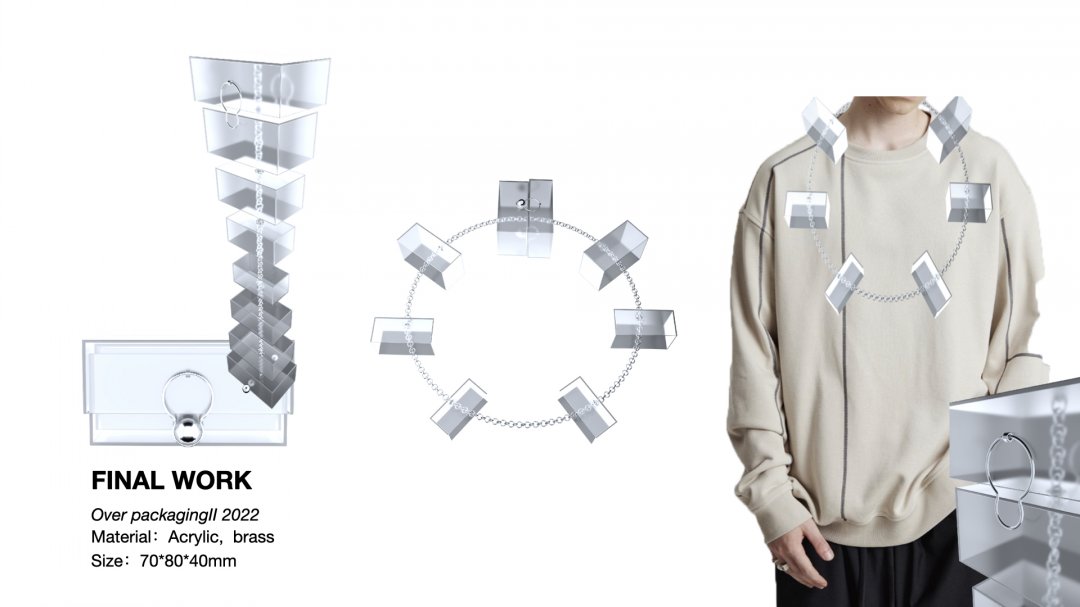 In the work "Over Packaging”, I want to discuss the phenomenon of overpackaging in consumerism. I combine the common packaging structure with the jewellery structure, and make them stack layer by layer so as to blur the boundary between packaging and jewellery. Also, I want to make people think about what they are wearing, packaging or jewellery.